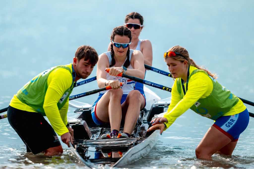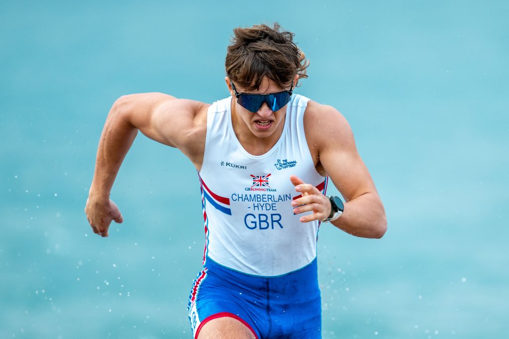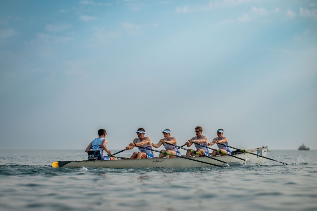Earlier in the day, the U19 races saw all crews progress with some strong performances in changeable conditions. First out was Sol Chamberlain-Hyde, who is full of confidence after his recent European championship title. He attacked the U19 Coastal Men’s Solo (CJM1x) time trial, finishing in a time of 2:35.33 and third fastest overall. With 32 entrants, he needed to finish in the top eight to avoid a second time trial and progress directly to the last 16. ”I’m pleased with that,” he said after the race, “not having to race another time trial was the aim and it’s great to be the first out and see what the conditions are like. I just want to row the best I can and learn as much as I can.”